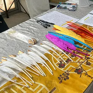 Add a refined and memorable touch to your event with Calligraphy on Feather Pen,a unique pre-event activity where guests receive a personalised feathered ballpoint pen with their name or a short message written on it in a calligraphy style.